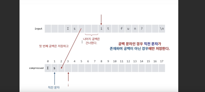 그 다음 공백을 읽을 때는 이제 i - 1 번째, 즉, compressed [ 2 ]에는 공백이 저장되어 있겠지. 이는 2개 이상의 공백이 연속되어 있다는 뜻이다. 그래서 이번에 만나는 공백은 무시하면 된다.