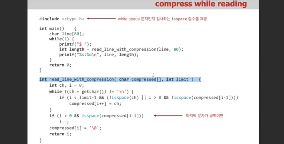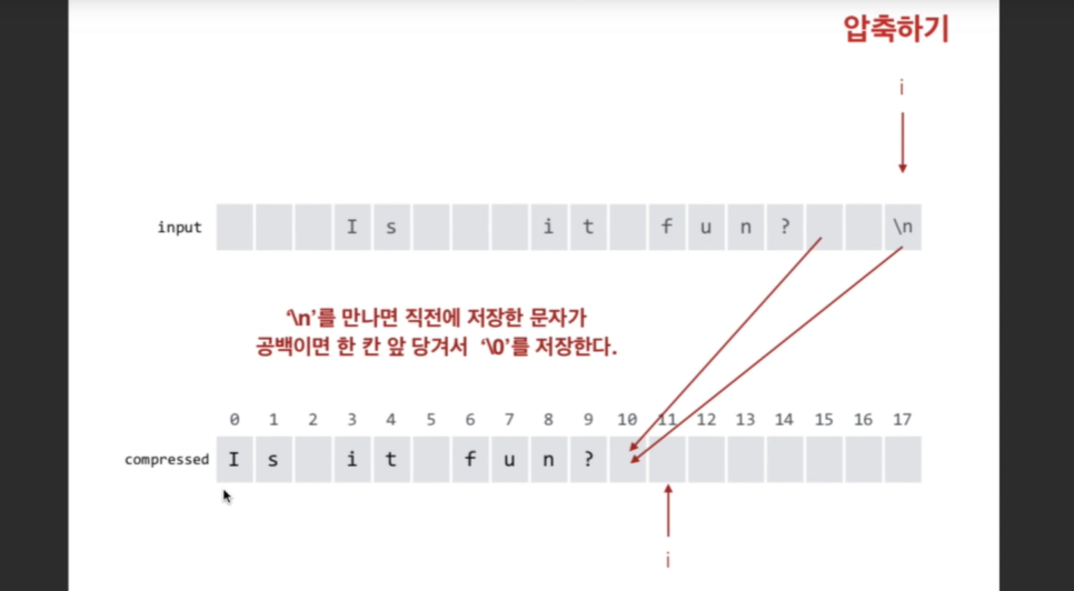 즉, imput 을 보면, 공백을 입력받기도 하는데, 이와 같이 불필요한 입력값들은 저장하지 말고, 필요한 것들만 compressed 라는 이름의 문자배열에 저장해서 출력하기.