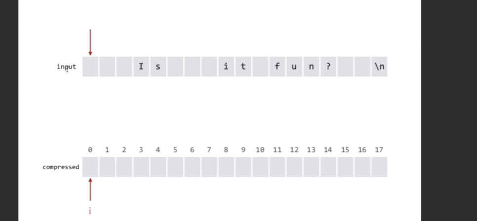 이 공백을 저장하고 나면, i 가 한칸 전진하여 compressed[ 3 ] 을 가리키게 될 것이다. compressed[ 2 ] 에는 공백이 저장되어 있고,