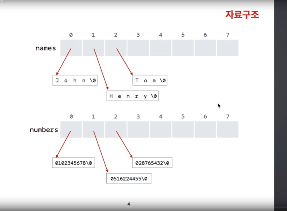 names[ ] 라는 배열에 저장되는 데이터의 타입은 "John\0" 과 같은 문자열 이다. 즉, 문자의 배열이다.