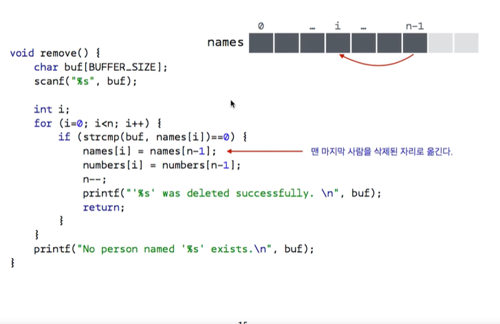 즉, n 까지, 빈칸 혹은 공백 없이 실제 사람의 정보가 저장되어 있다는 가정하에 코드가 돌아가는 것인데, remove 함수에서 특정 정보를 제거하고, 그 부분을 빈칸으로 놔두게 되면, 이러한 코드들은 돌아가지 않는다.