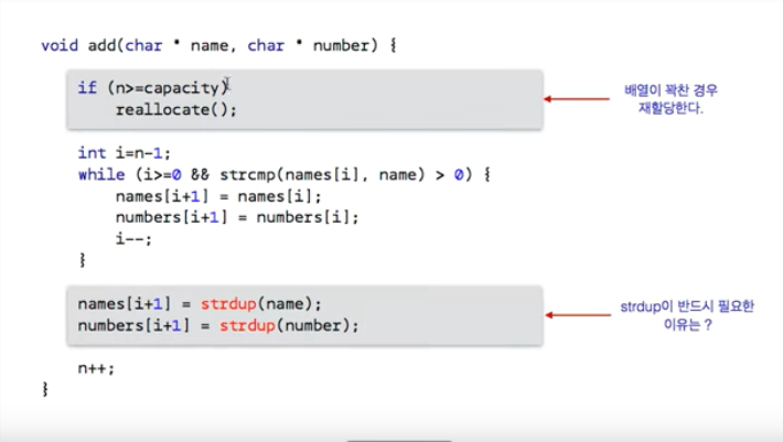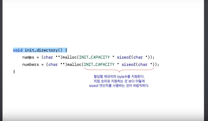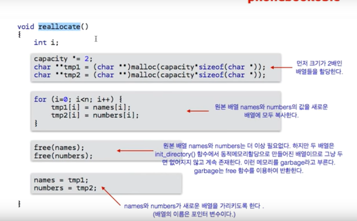 지금까지는 우리가 사람 이름과, 전화 번호부를 저장할 부분을 배열로 설정했는데, 이 배열의 크기를 필요시 더 키우기 위해, names, numbers 를 더 배열이 아니라, 포인터로 선언한다.