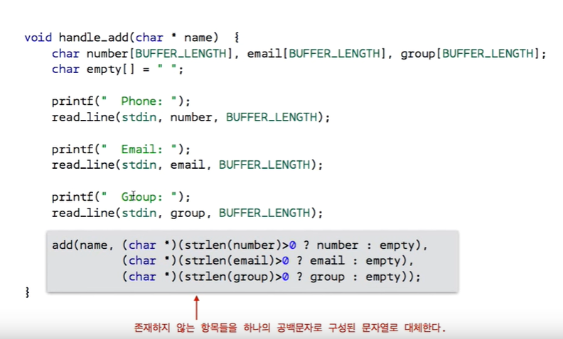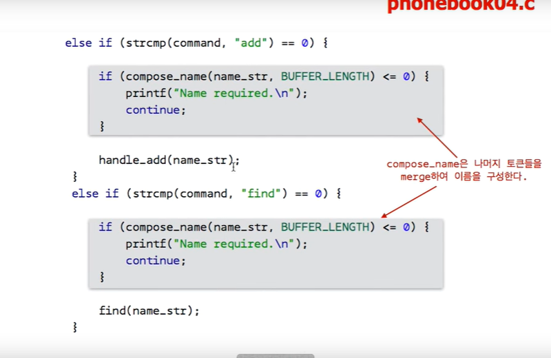 반면, add 뒤에는 4개의 정보가 나오고, 그 사이사이에 공백이 포함되거나, 각 정보안에 공백이 있을 수 있다. 그래서 strtok 이 아니라, 사용자 정의함수를 따로 만들어서, 정보를 읽어내야 한다.