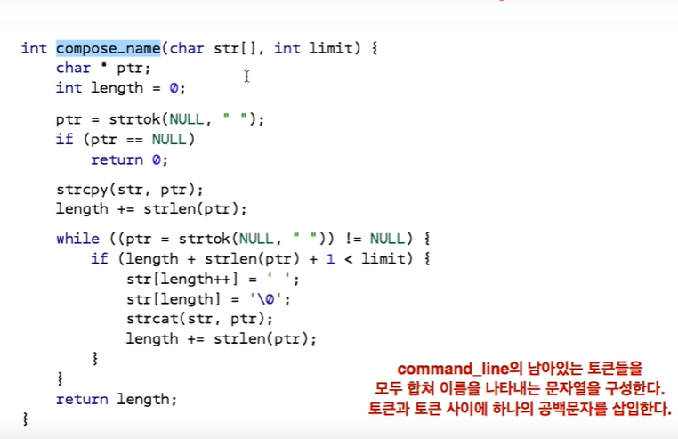 compose_name 함수는 command_line 에서, 앞뒤에 붙은 불필요한 공백들을 제거하고, 단어와 단어 사이의 2개 사이의 공백이 있을 때, 그것을 하나의 공백으로 축약하는 것. name_str 이라는 이름으로 축약하기.