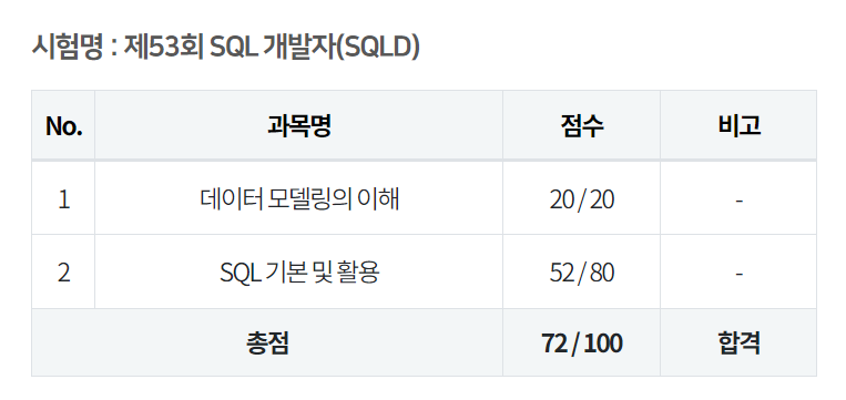 2024.05.25 일 SQLD 개발자 시험을 응시했고 72점이라는 점수로 합격했다.