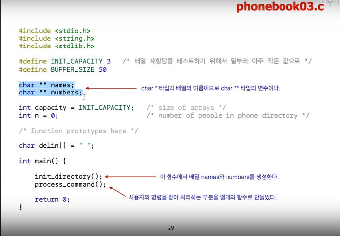 지금까지는 우리가 사람 이름과, 전화 번호부를 저장할 부분을 배열로 설정했는데, 이 배열의 크기를 필요시 더 키우기 위해, names, numbers 를 더 배열이 아니라, 포인터로 선언한다.