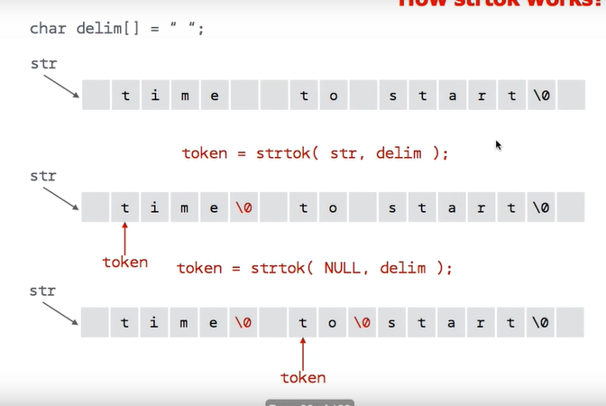 즉, 2번째 호출에서는 반드시 첫번째 매개변수로 str 이 아니라, NULL 이며, 두번째 token = strtok( NULL, delim) 에서는, 2번째 token의 주소, 즉, 2번째 token 의 첫번째 값의 주소
