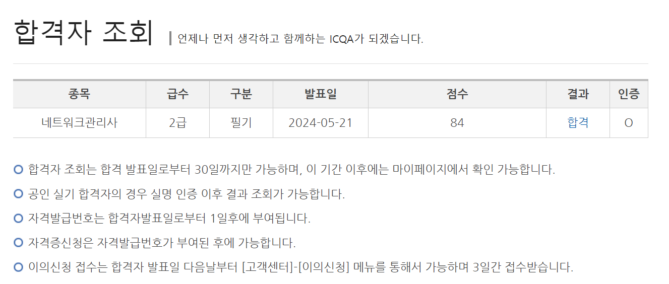 2024년 5월 19일 네트워크 관리사 2급 필기 시험을 봤다.