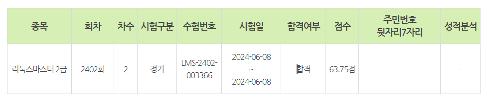 2024.06.08 일 리눅스 마스터 2급 2차 시험을 응시했고 63.75점이라는 턱걸이..? 점수로 합격했다.