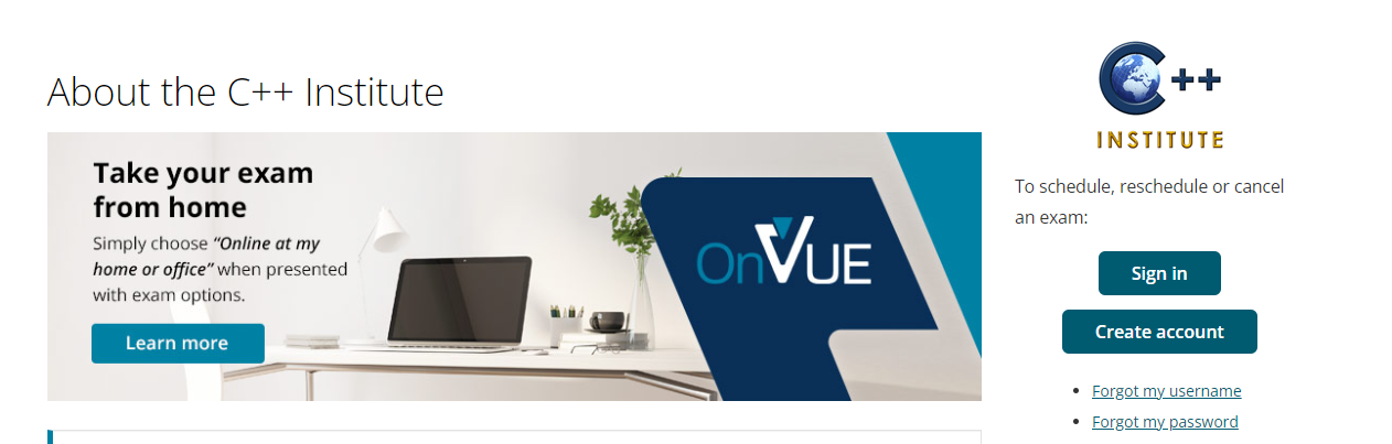 Get certified from your home or office Take your C++ Institute exam conveniently from home through OnVUE online proctoring. A live proctor will monitor you through the webcam on your workstation to provide a secure exam experience. Watch the short video on