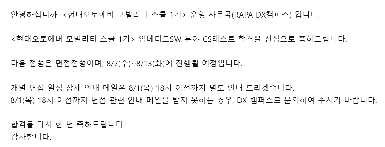 2024 현대오토에버 모빌리티 SW 스쿨에서 "임베디드" 분야에 지원했고 CS 테스트를 합격했다.