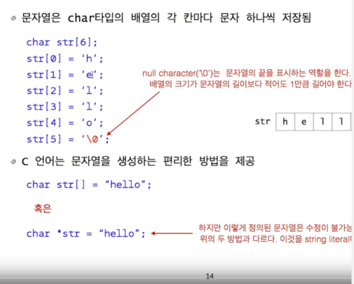 char str[] = "hello" //- < 포인터 > // 배열의 이름은, 그 배열의 시작 주소를 // 가리키는 포인터 변수이다. // 문자열을 생성할 때 아래와 같이 할 수 있다. // "hello" 문장에서 hello를 저장하는 6byte 의 메모리 공간이 할당되고, 거기에 NULL 까지 저장된 다음에 , 그 배열의 시작 주소를 return 해주면, "문자형" 포인터 변수 str 에 저장하는 것이다. 즉, str 은, "hello" 담긴 배열의 시작점 주소를 가리키는 포인터 주소이다. char *str = "hello"