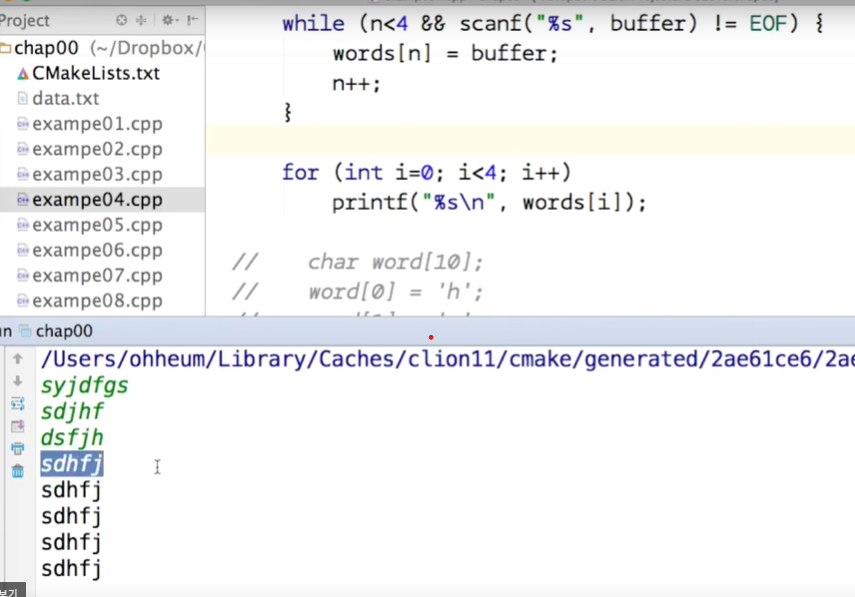 그 이후 words[ n ] 에 저장된 , 각각의 문자열을 출력해보면, buffer 라는 하나의 배열 안에, 저장되어 있는 문자열이 4번 연속되어 출력되는 것이다.
