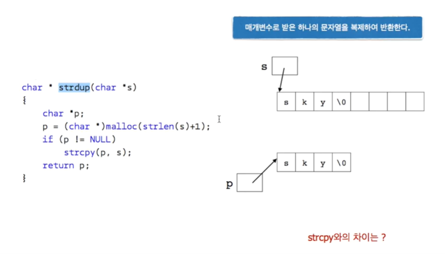 strdup 가 하는 일은, 입력으로 하나의 문자열 s 를 받아서, s 가 하나의 문자열이니까, s 는 문자배열의 시작 주소를 저장하는 포인터 이다.