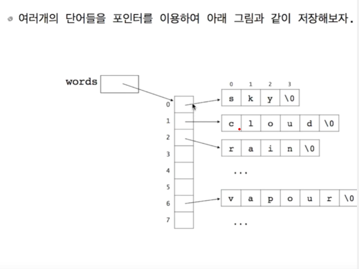 하나의 단어는 sky\0 와 같이, 문자들의 배열로 저장이 되는데, 이런 단어들이 저마다 길이도 다른 , 이런 단어들이