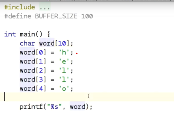 그런데 우리는 word[ 0 ] 부터, word[ 4] 까지의 공간만을 할당했다. 즉, hello 라는 5개의 문자만 저장했다.